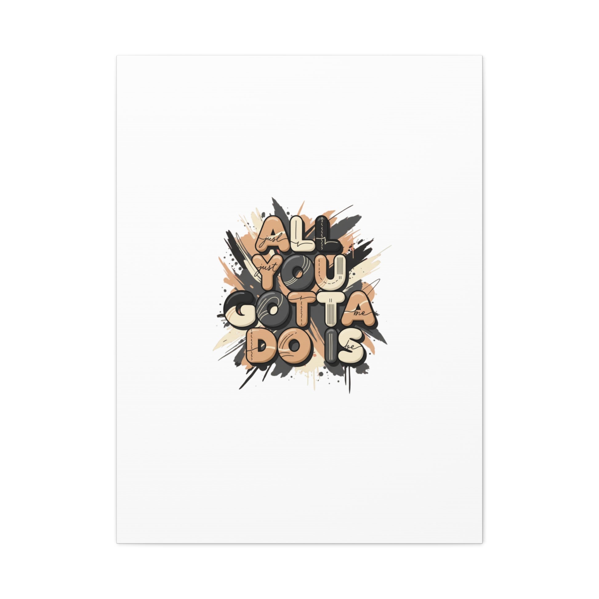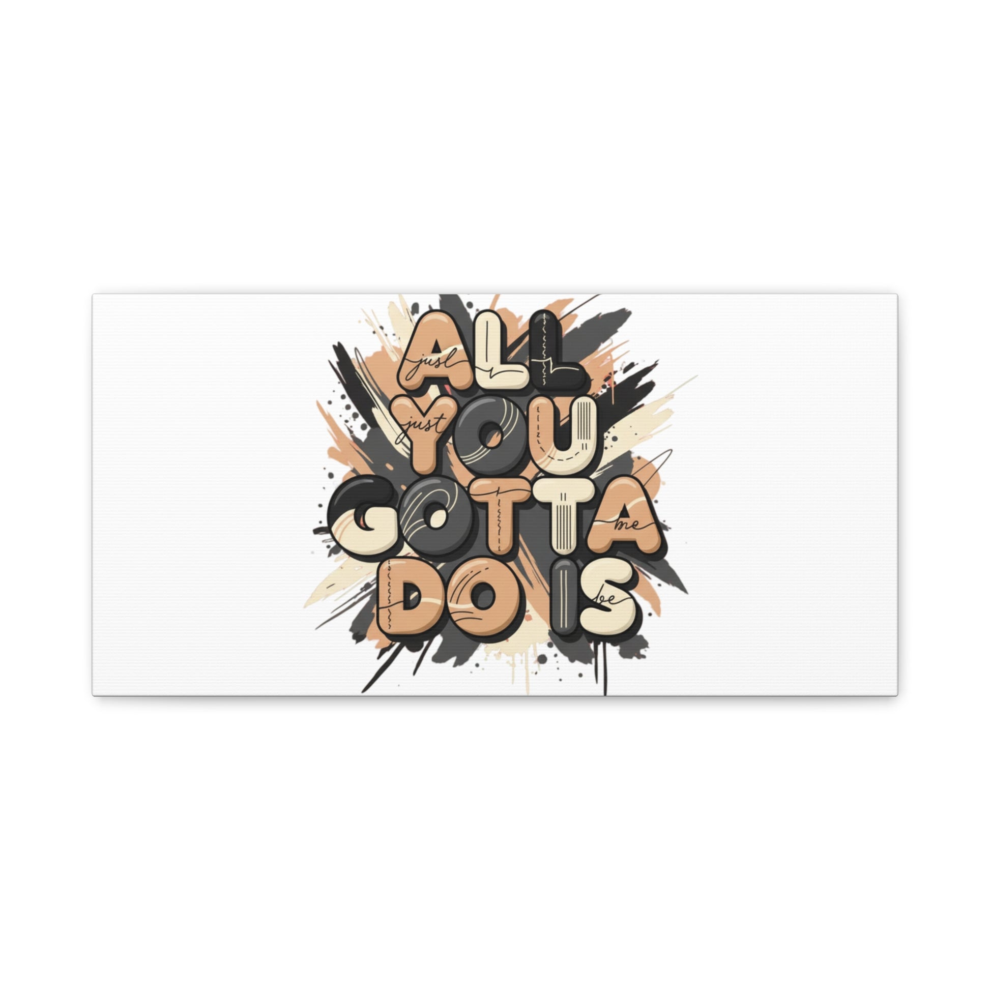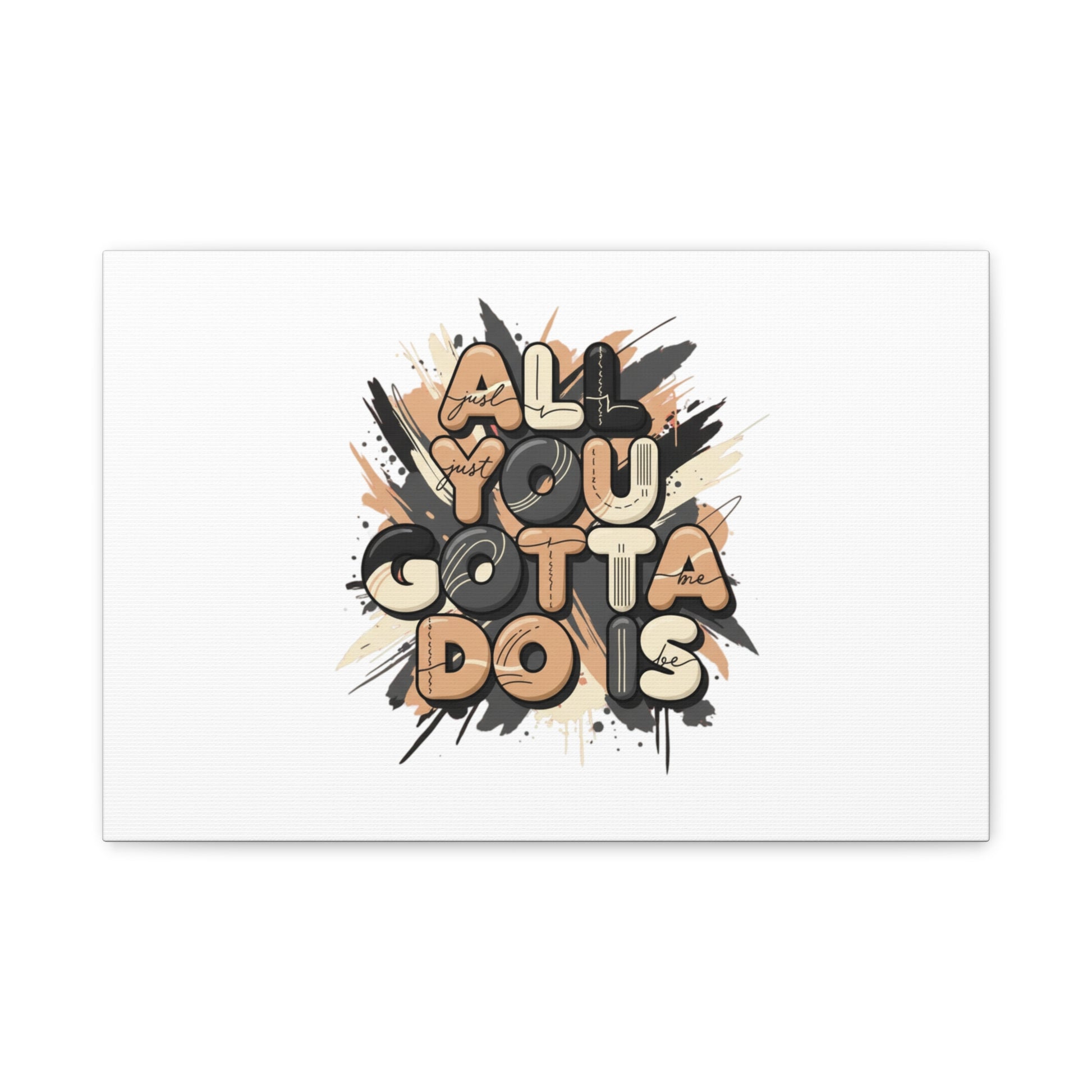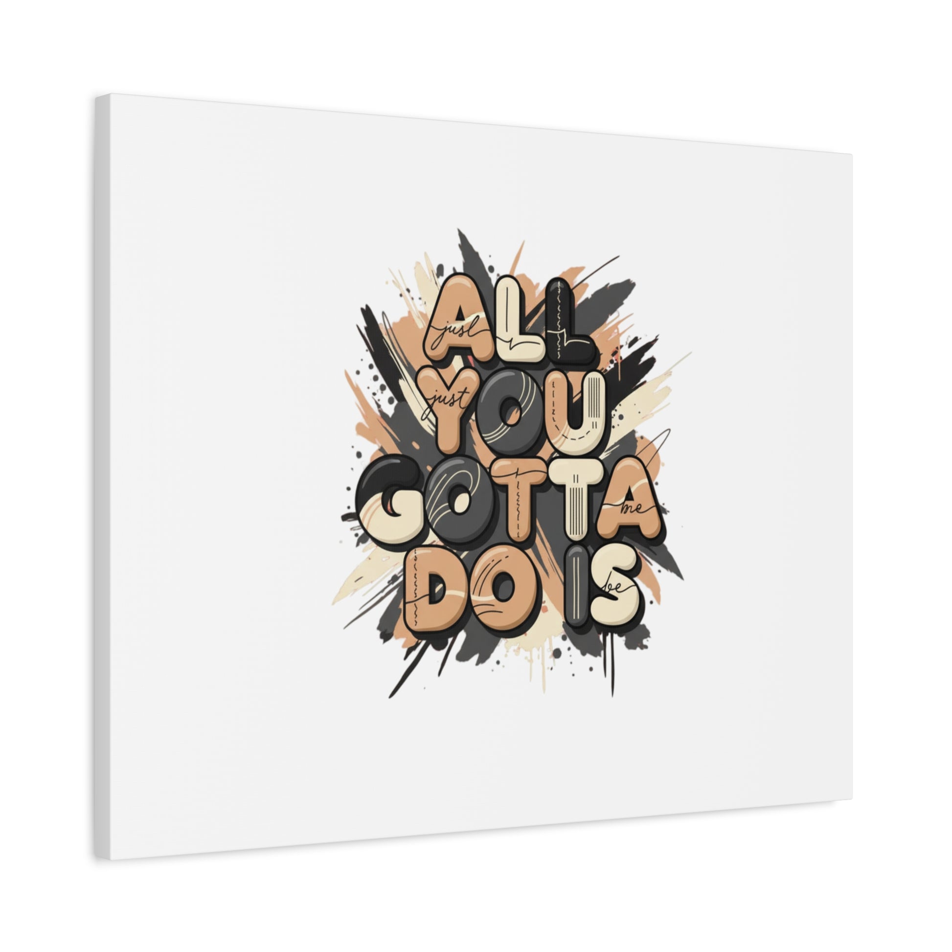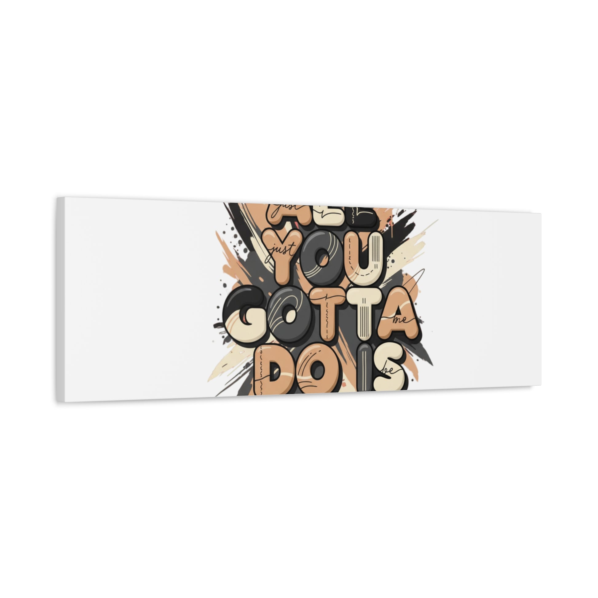 Layered, chaotic typography with a tongue-in-cheek slogan rendered in mixed, bold letterforms and paint-splatter accents — a canvas print that channels the Slogan & Nonsense Graphics trend with glitch-adjacent, internet-native energy. The artwork pairs chunky, rounded type with high-contrast ink splashes in warm beige and charcoal, creating a loud focal statement that reads like an inside joke for meme-aware viewers. Sized and stretched for wall display, it works as a statement piece in a studio, dorm, or media room where fast-moving online culture and ironic slogans are part of the aesthetic.