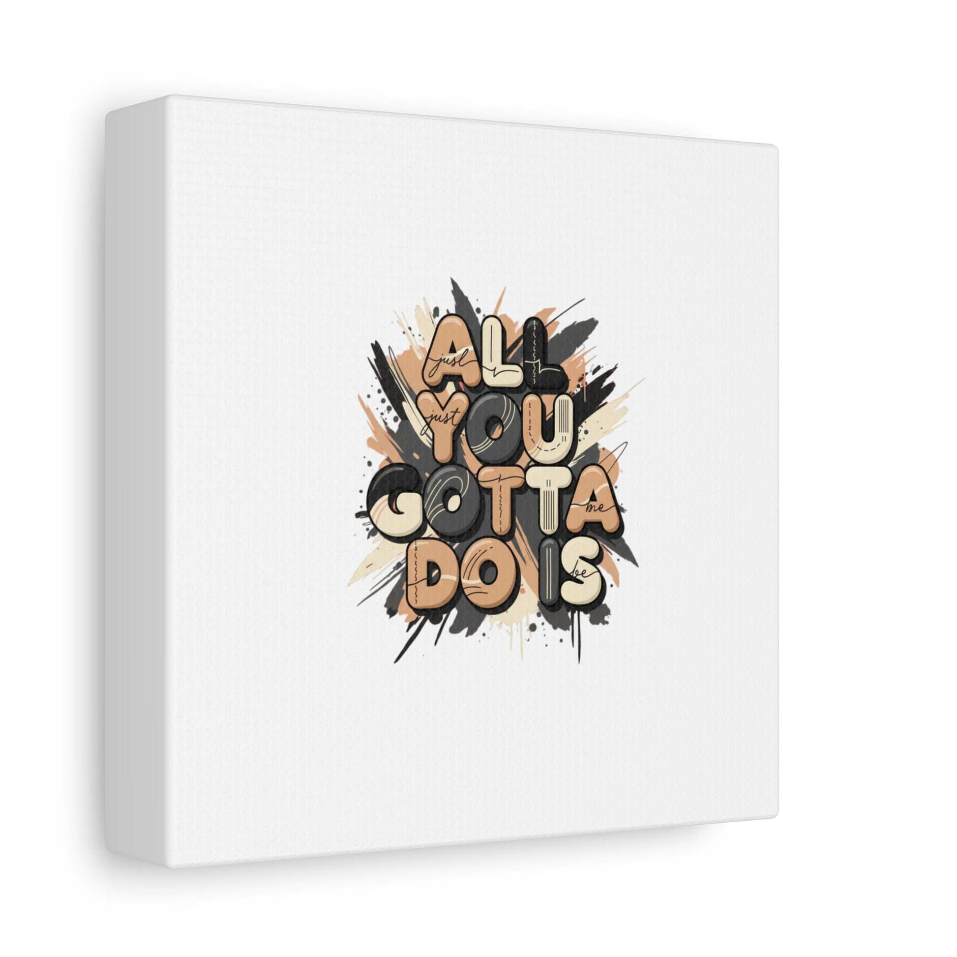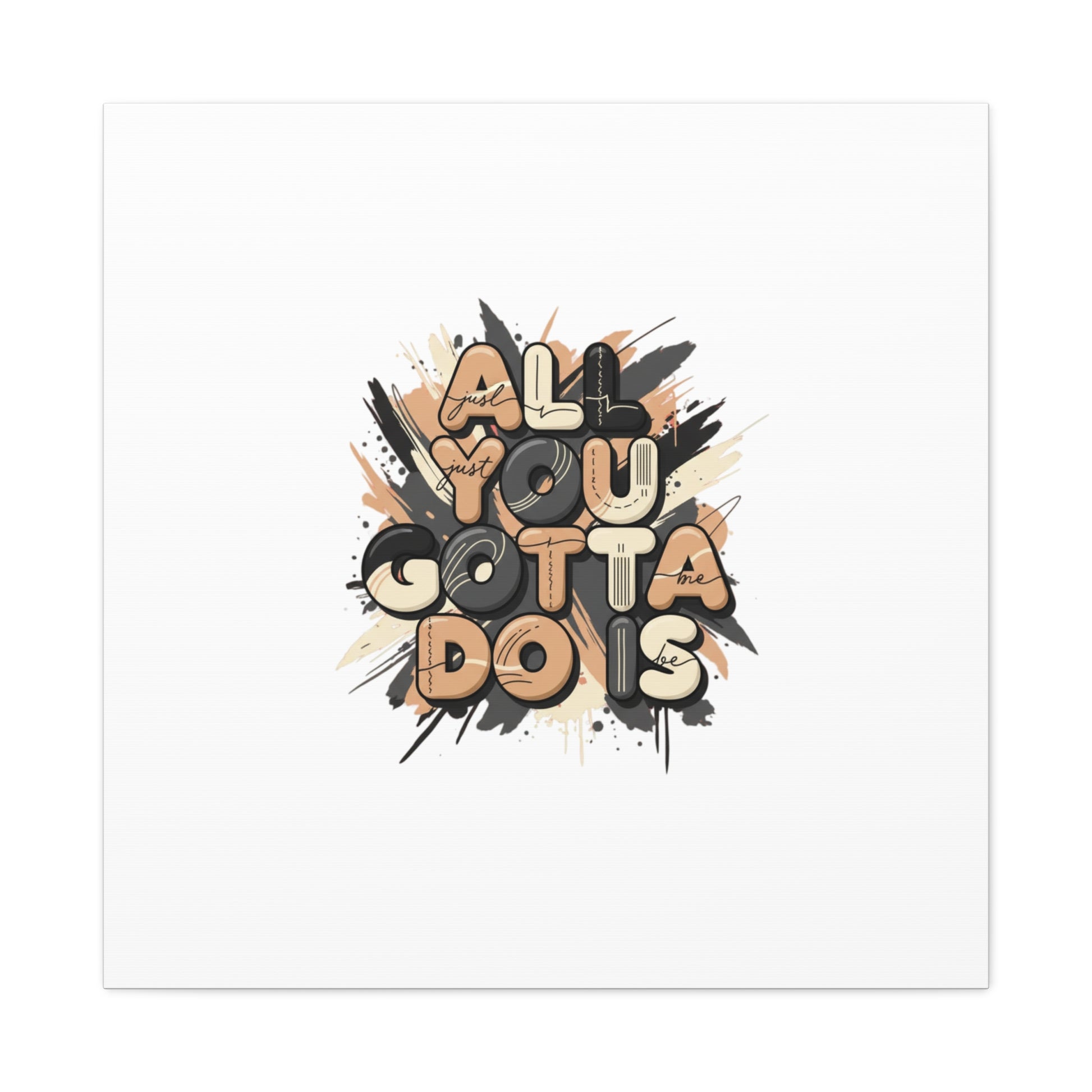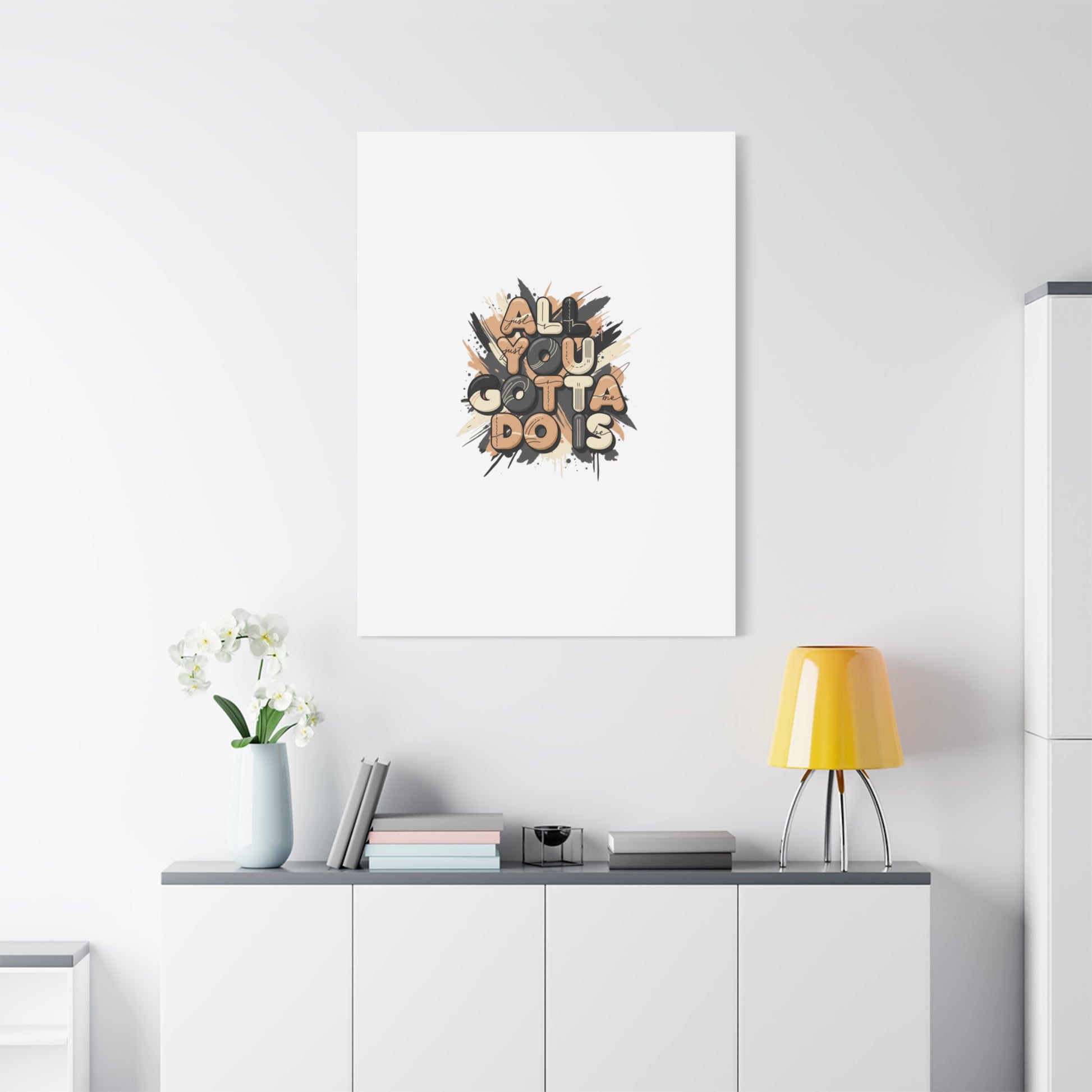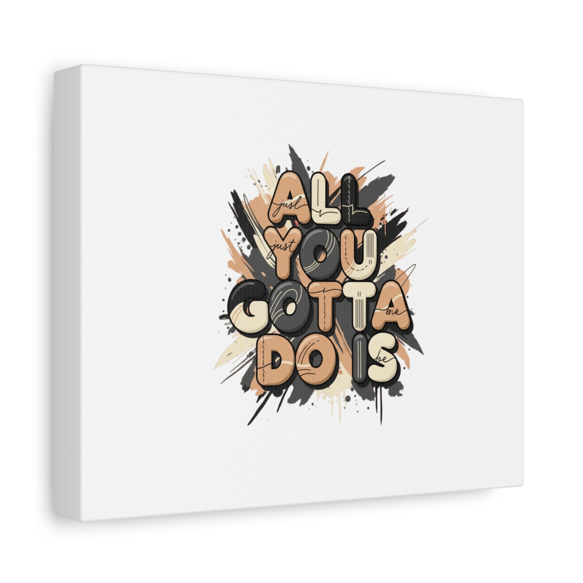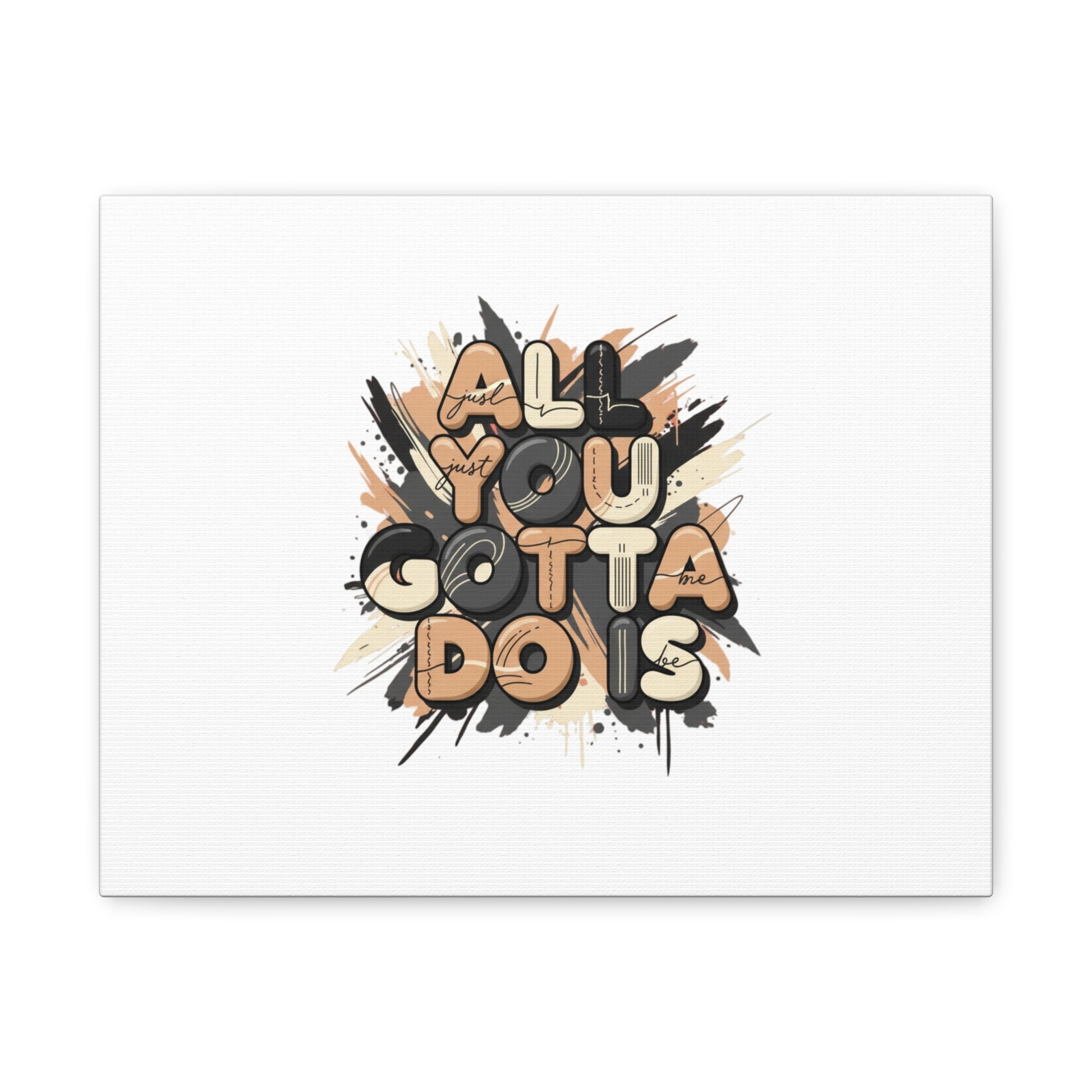 Layered, chaotic typography with a tongue-in-cheek slogan rendered in mixed, bold letterforms and paint-splatter accents — a canvas print that channels the Slogan & Nonsense Graphics trend with glitch-adjacent, internet-native energy. The artwork pairs chunky, rounded type with high-contrast ink splashes in warm beige and charcoal, creating a loud focal statement that reads like an inside joke for meme-aware viewers. Sized and stretched for wall display, it works as a statement piece in a studio, dorm, or media room where fast-moving online culture and ironic slogans are part of the aesthetic.