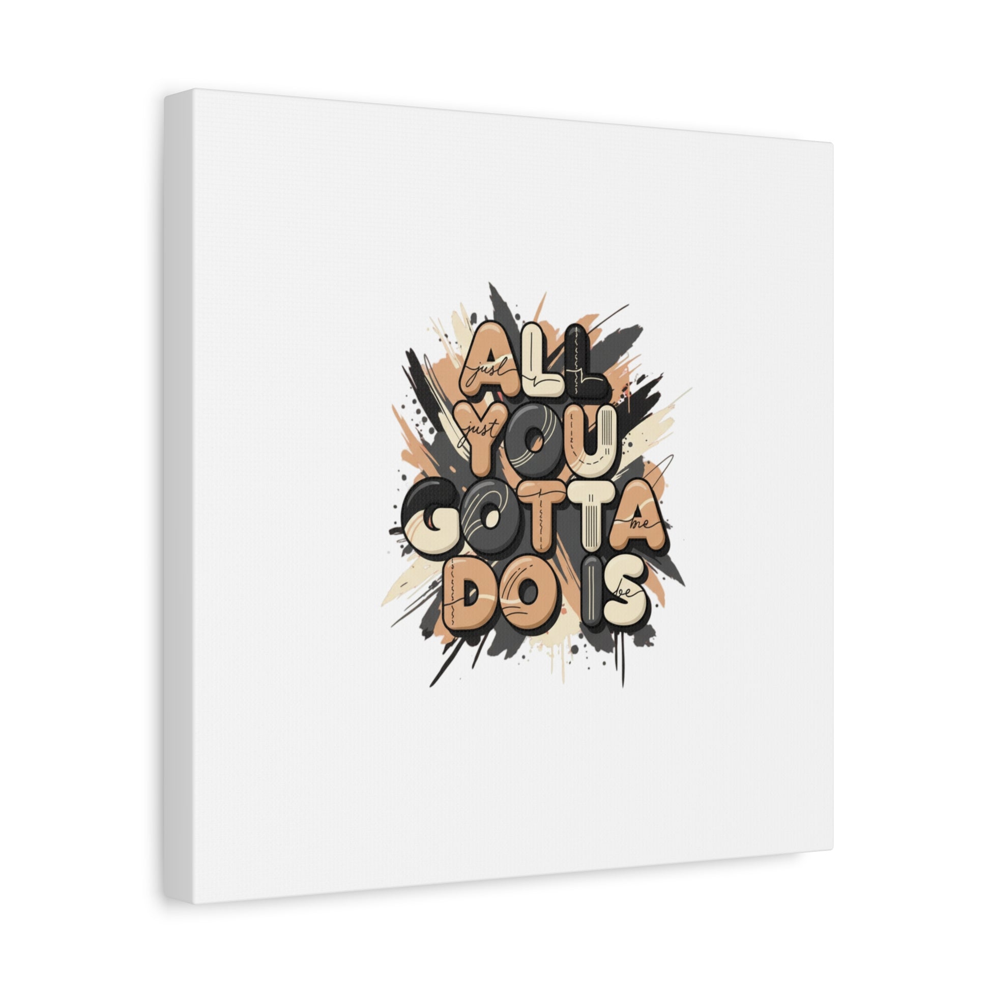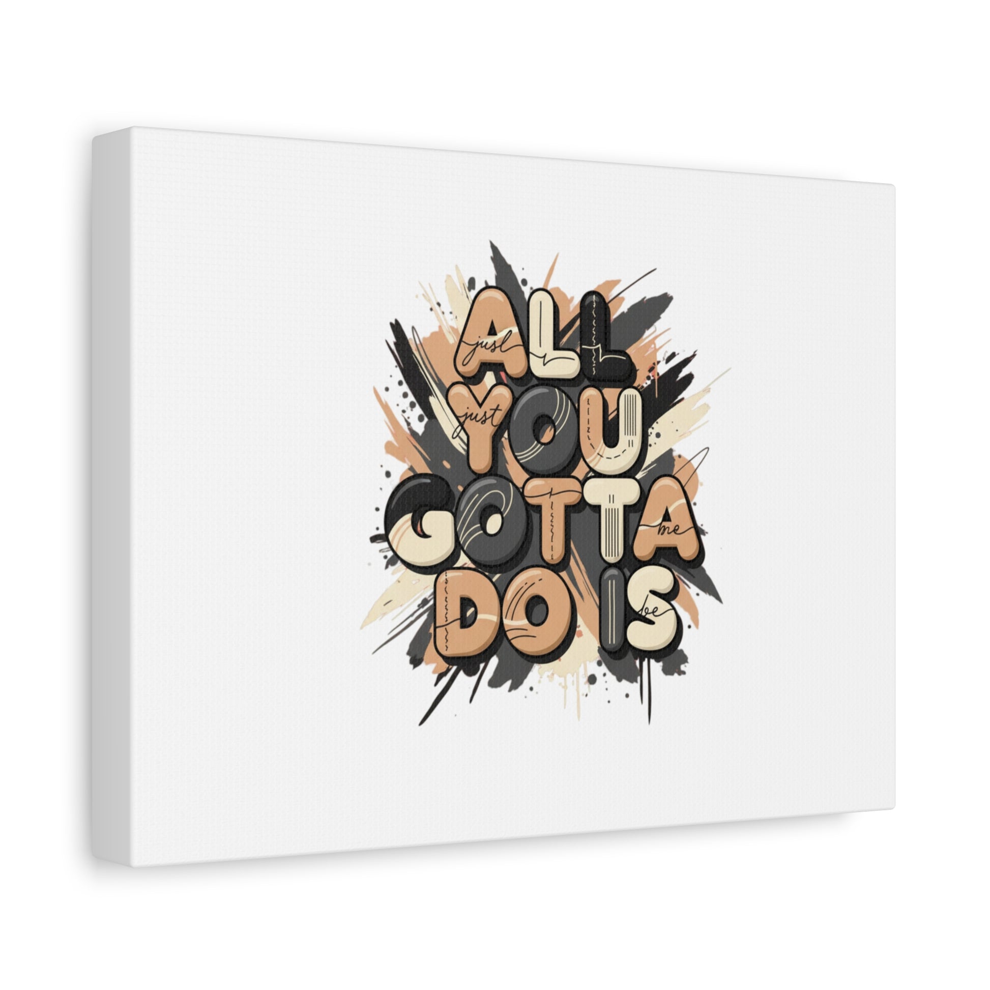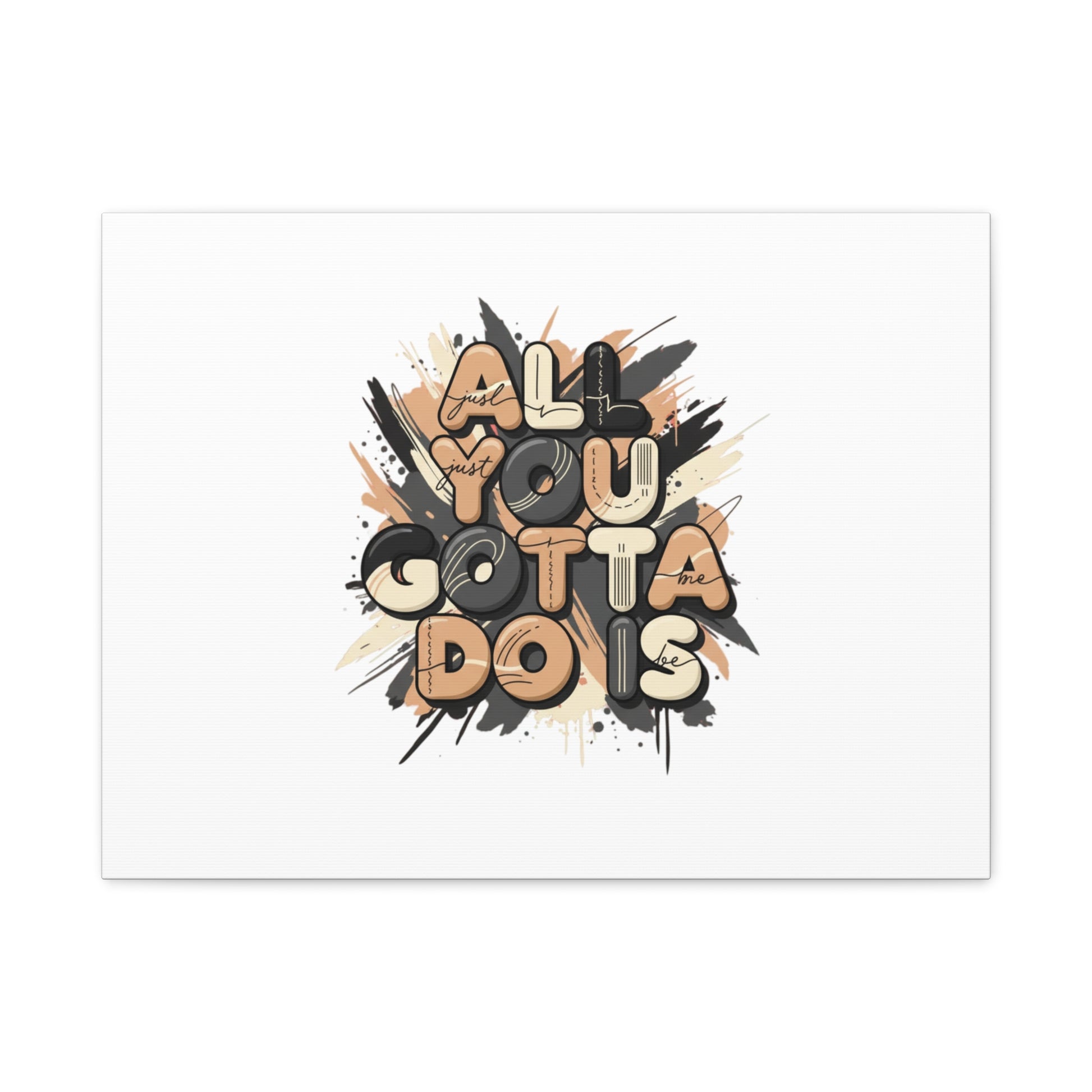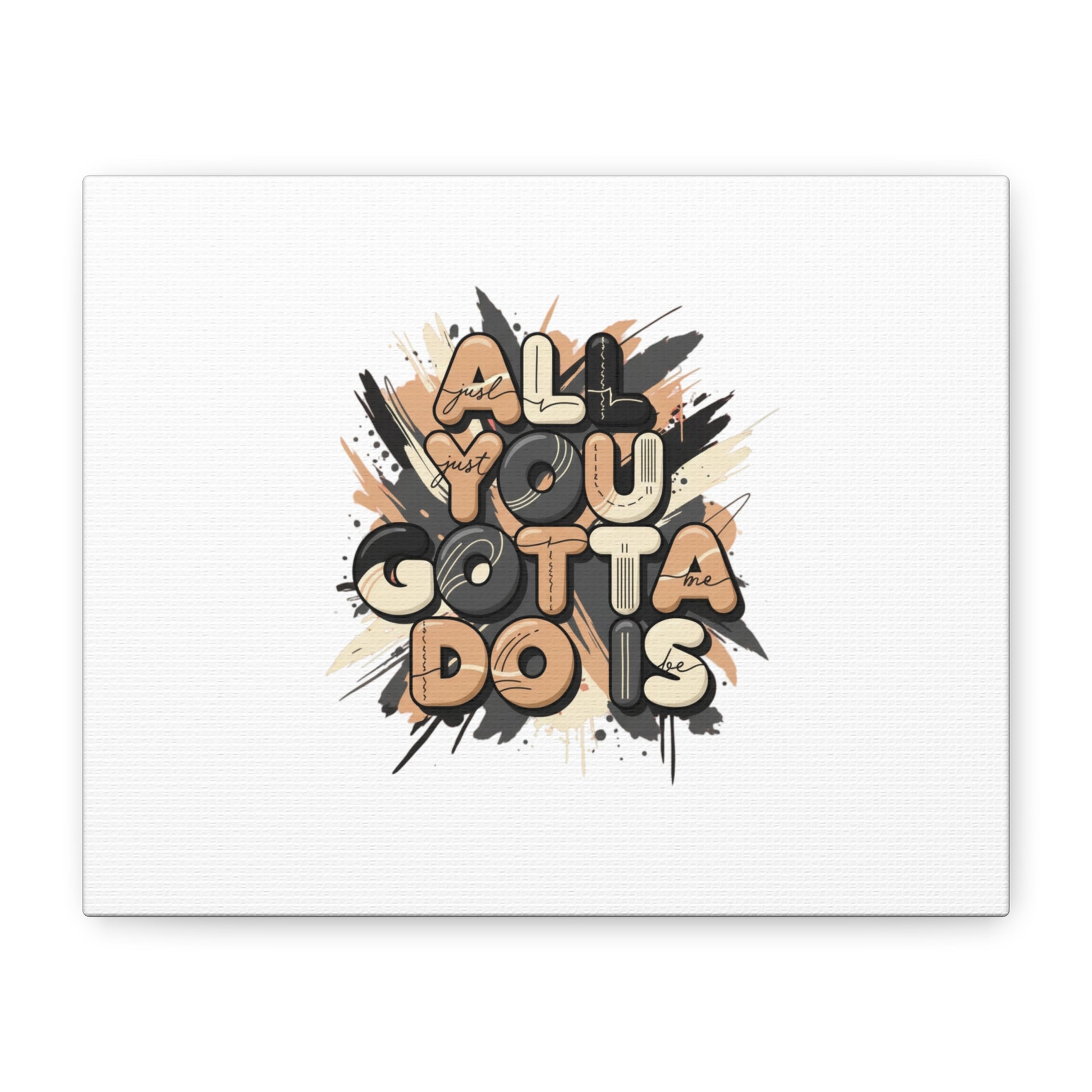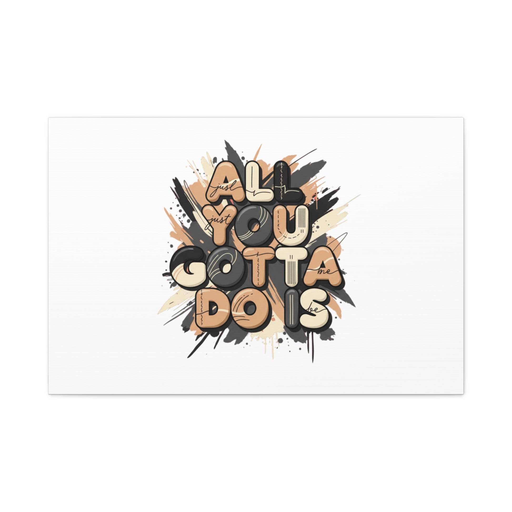 Layered, chaotic typography with a tongue-in-cheek slogan rendered in mixed, bold letterforms and paint-splatter accents — a canvas print that channels the Slogan & Nonsense Graphics trend with glitch-adjacent, internet-native energy. The artwork pairs chunky, rounded type with high-contrast ink splashes in warm beige and charcoal, creating a loud focal statement that reads like an inside joke for meme-aware viewers. Sized and stretched for wall display, it works as a statement piece in a studio, dorm, or media room where fast-moving online culture and ironic slogans are part of the aesthetic.