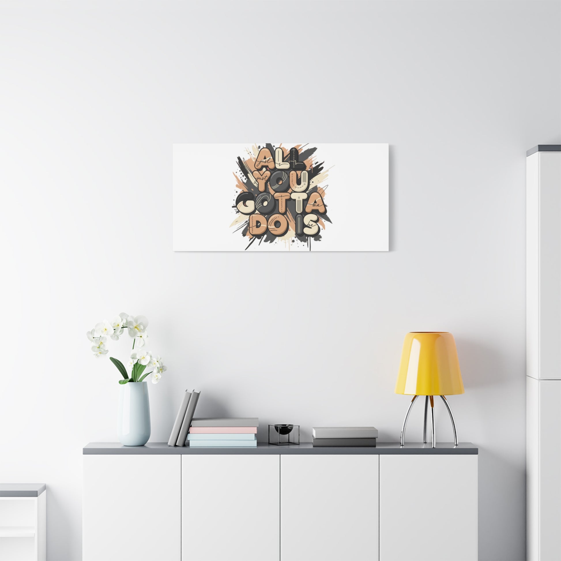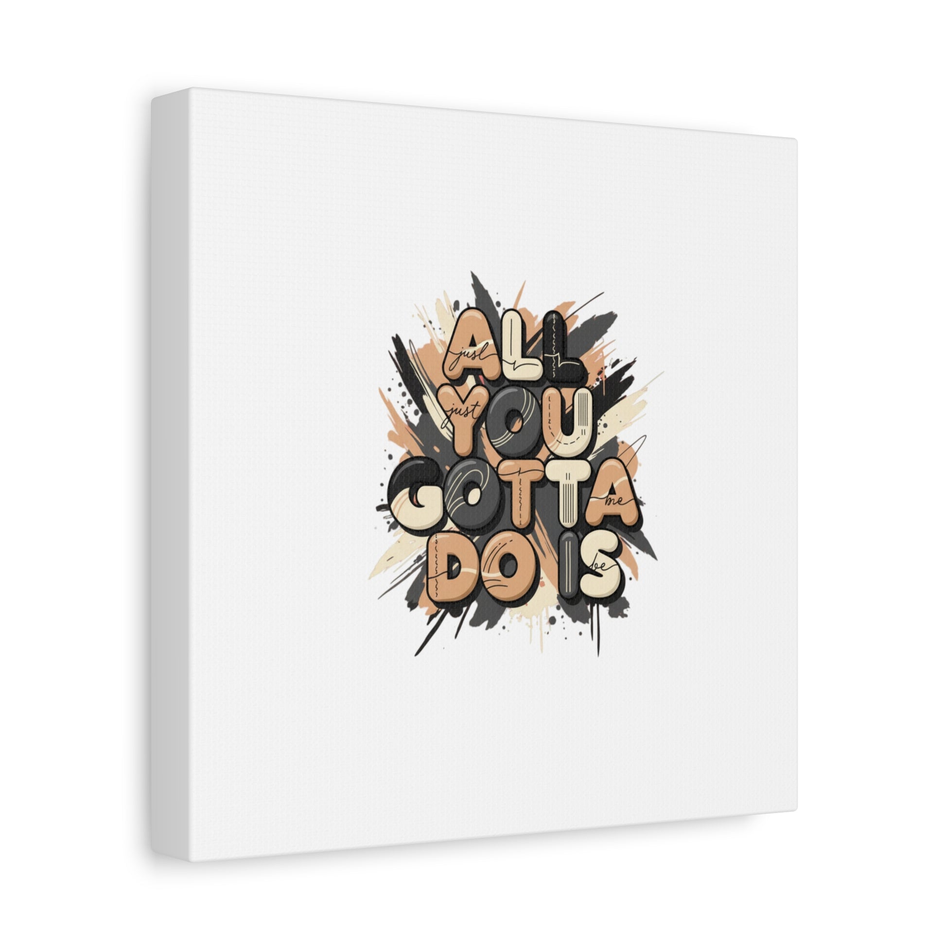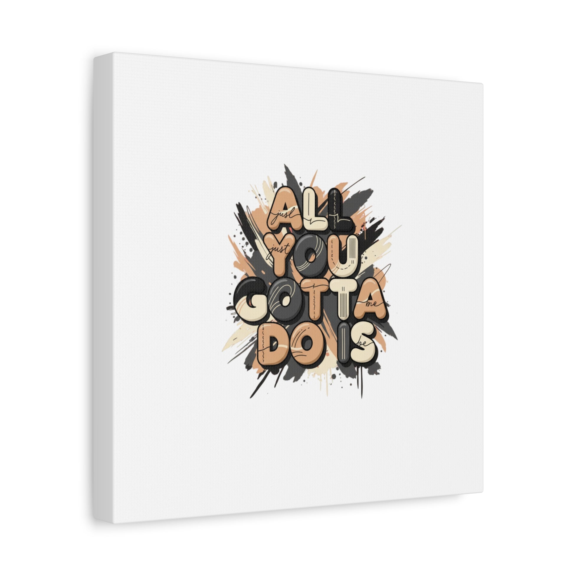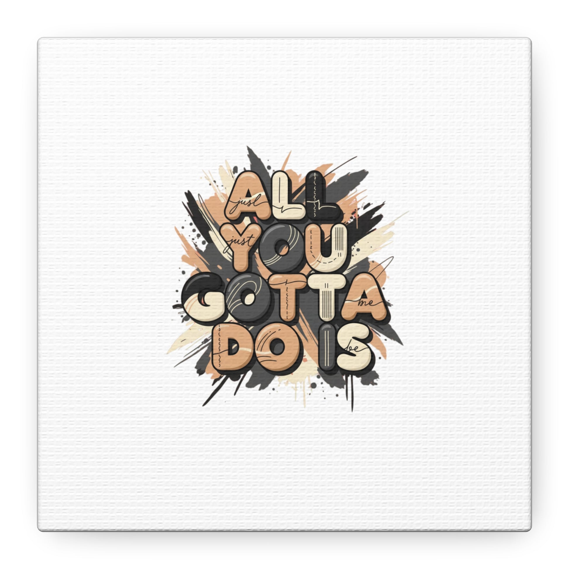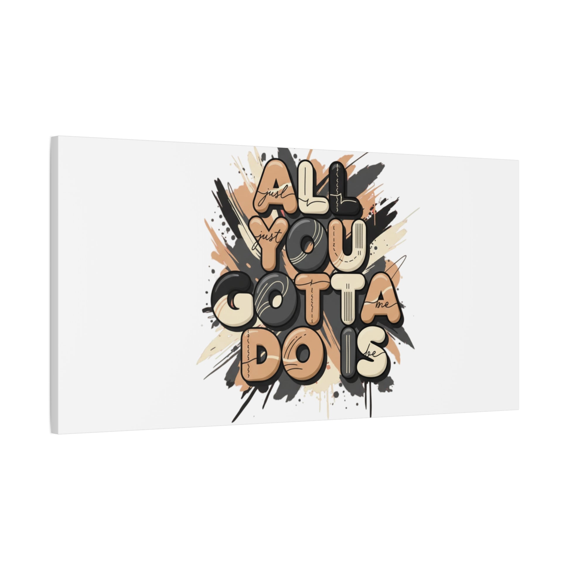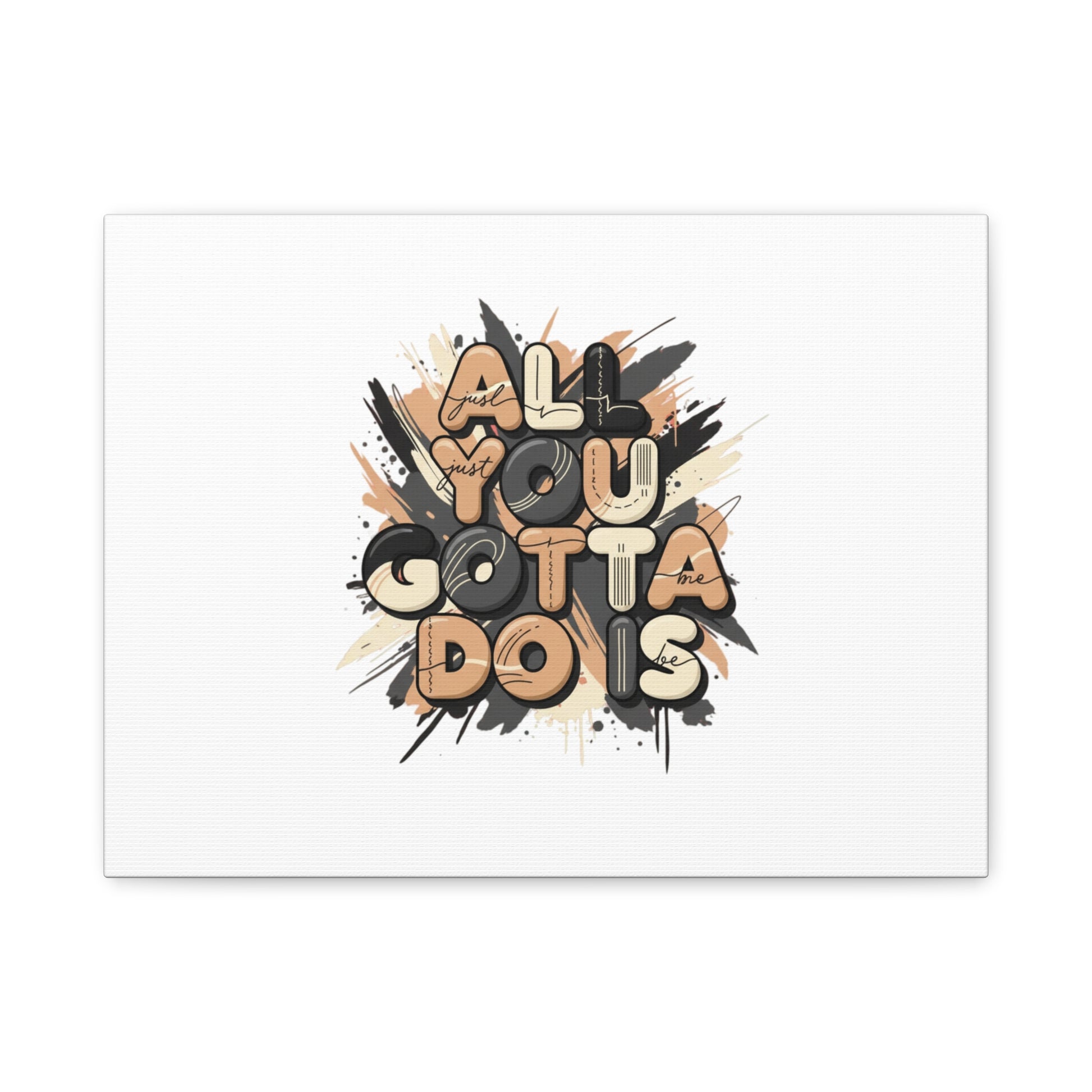 Layered, chaotic typography with a tongue-in-cheek slogan rendered in mixed, bold letterforms and paint-splatter accents — a canvas print that channels the Slogan & Nonsense Graphics trend with glitch-adjacent, internet-native energy. The artwork pairs chunky, rounded type with high-contrast ink splashes in warm beige and charcoal, creating a loud focal statement that reads like an inside joke for meme-aware viewers. Sized and stretched for wall display, it works as a statement piece in a studio, dorm, or media room where fast-moving online culture and ironic slogans are part of the aesthetic.